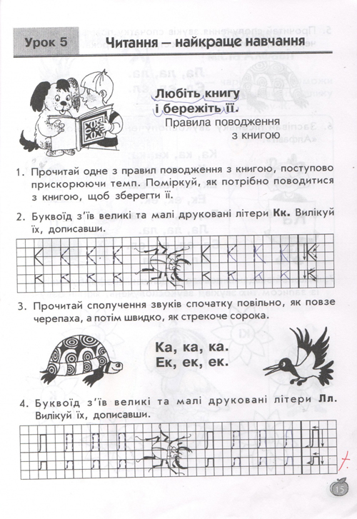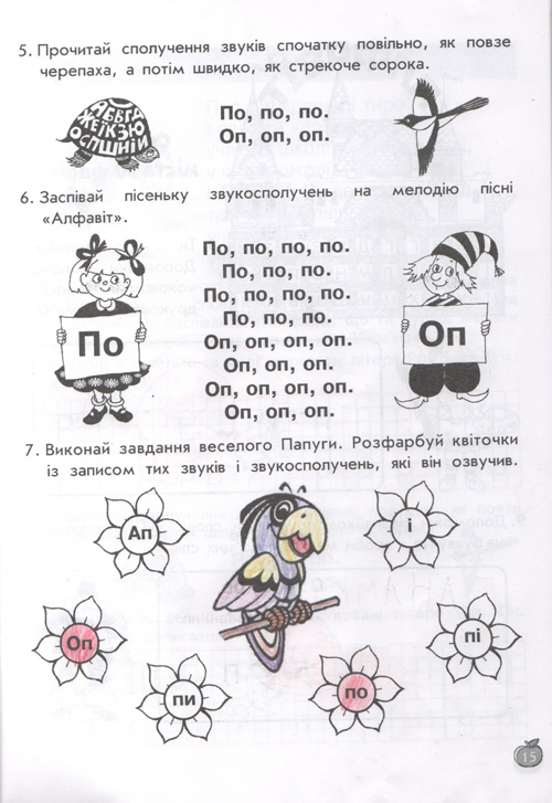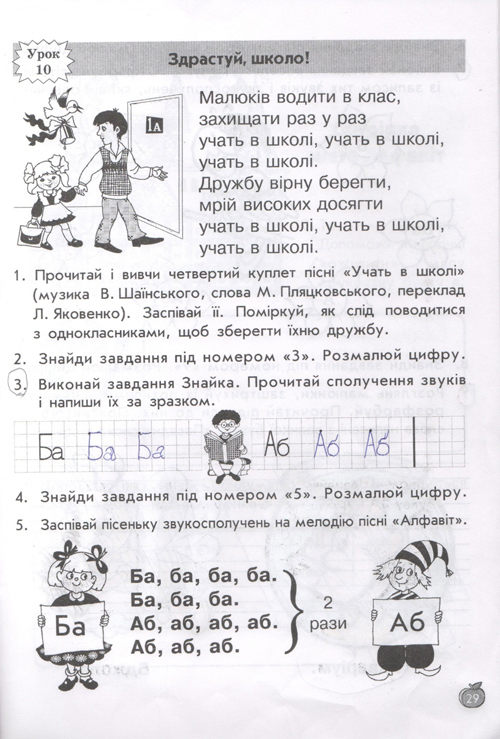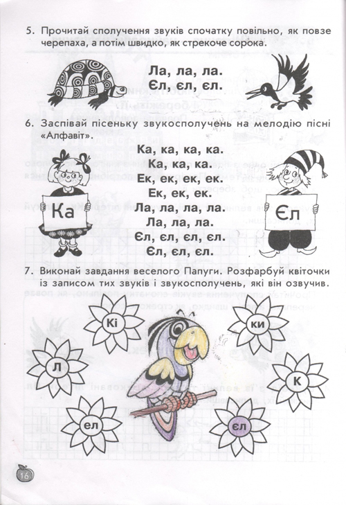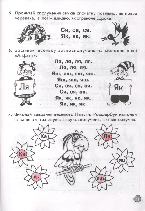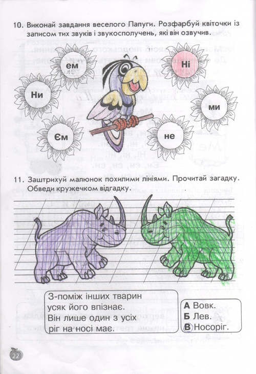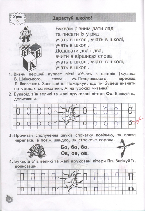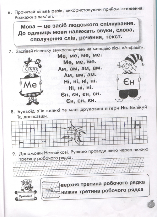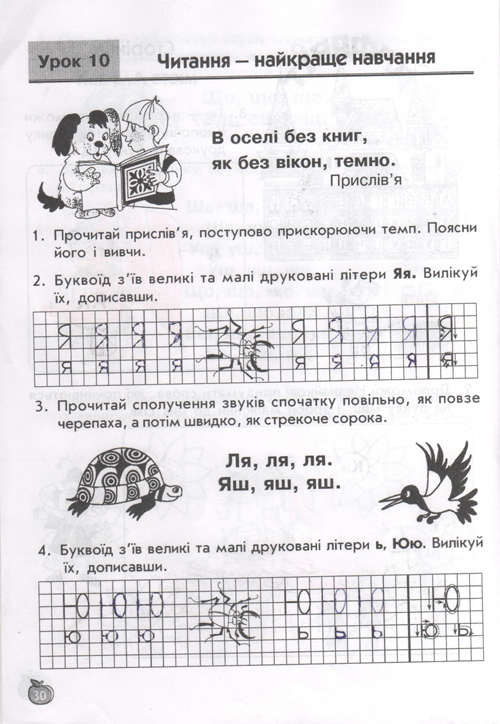 остальные уроки построены по тому же принципу, по три урока в день (чтение, письмо, навч.разом) у детей тот же попугай, жук-буквоед, пропевки слогов,