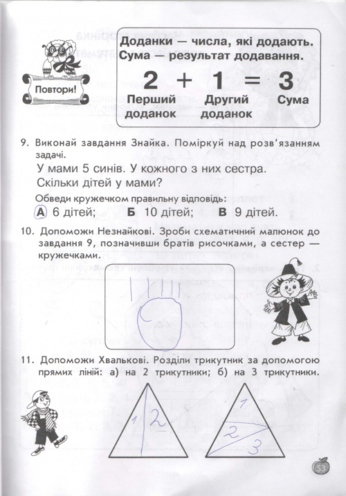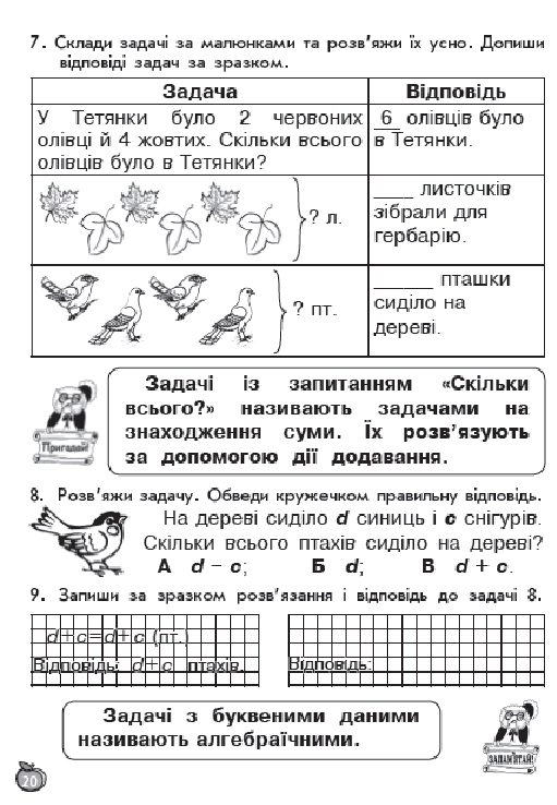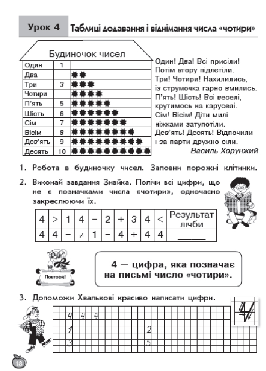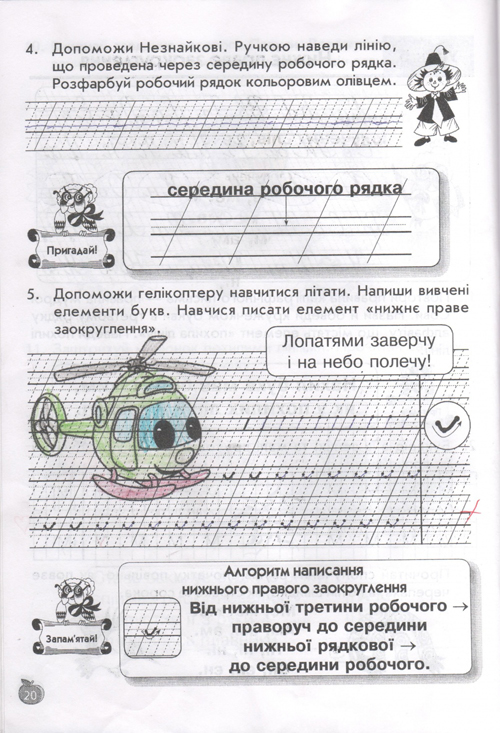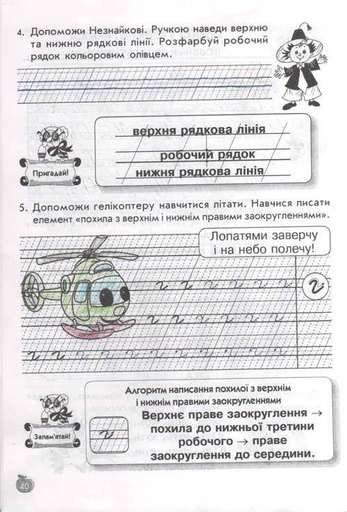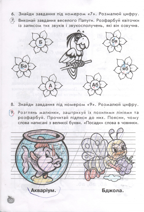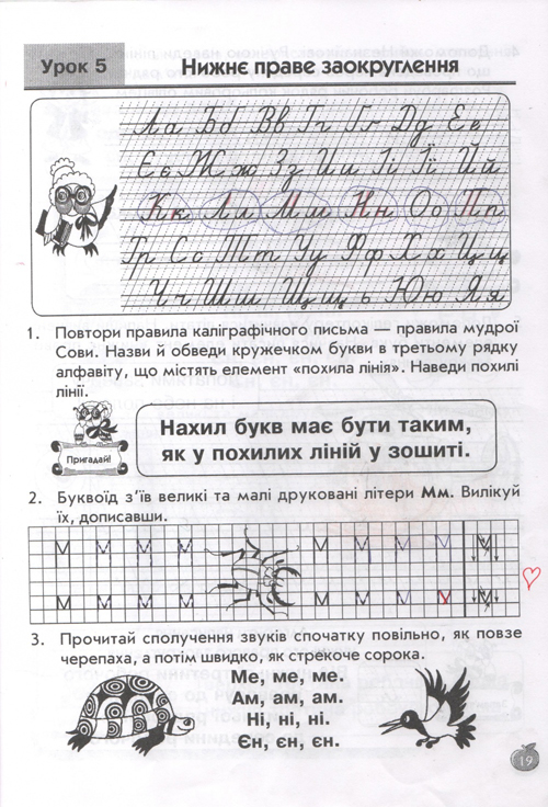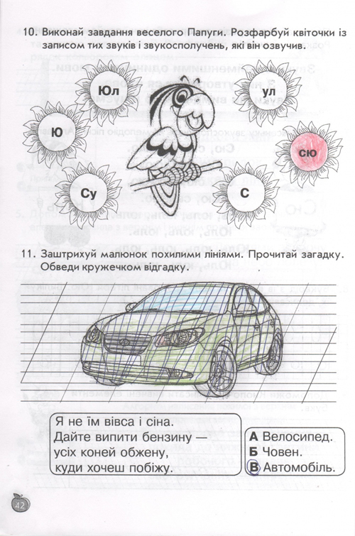 остальные уроки построены по тому же принципу, по три урока в день (чтение, письмо, навч.разом) у детей тот же попугай, жук-буквоед, пропевки слогов,